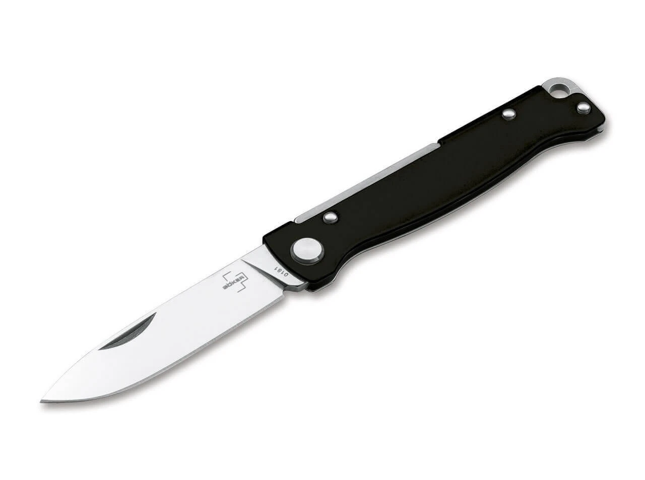 Das schnörkellose Böker Plus Atlas ist ein zuverlässiges Slipjoint-Taschenmesser mit einem Griffkörper aus geschwärztem Edelstahl. Die minimalistische Konstruktion ist überaus robust und macht das handliche Messer zum perfekten Begleiter in allen Lebenslagen. Die satinierte Droppoint-Klinge aus 12C27 wird per Nagelhau geöffnet und bewältigt alle anfallenden Schneidaufgaben des Alltags problemlos. Mit Fangriemenöse und Clip (Tip-up/r).