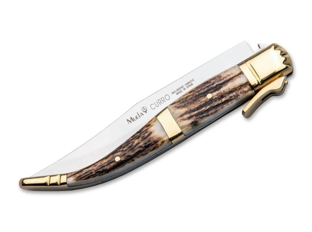 Das Muela Curro-A ist ein traditionelles spanisches Bandoleromesser in höchster Qualität. Die Griffbeschalung aus Hirschhorn mit Messingeinlagen verleiht dem Messer eine edle Optik. Die Klinge ist aus X50CrMoV15, einem hochwertigen Chrom–Molybdän-Vanadium-legierten Stahl gefertigt und traditionell nicht feststellbar. Lieferung in einer hochwertigen Schatulle.