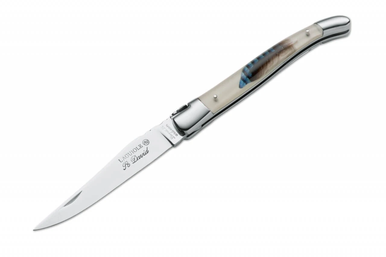 Die weiße Kunstharzbeschalung zeigt auf jeder Seite eine echte Eichelhäherfeder mit dem charakteristischen blauen Schimmer, sicher auf immer und ewig unter Acryl eingefangen. Polierte Klinge und polierte Edelstahlbacken. Filework an der Rückenfeder.