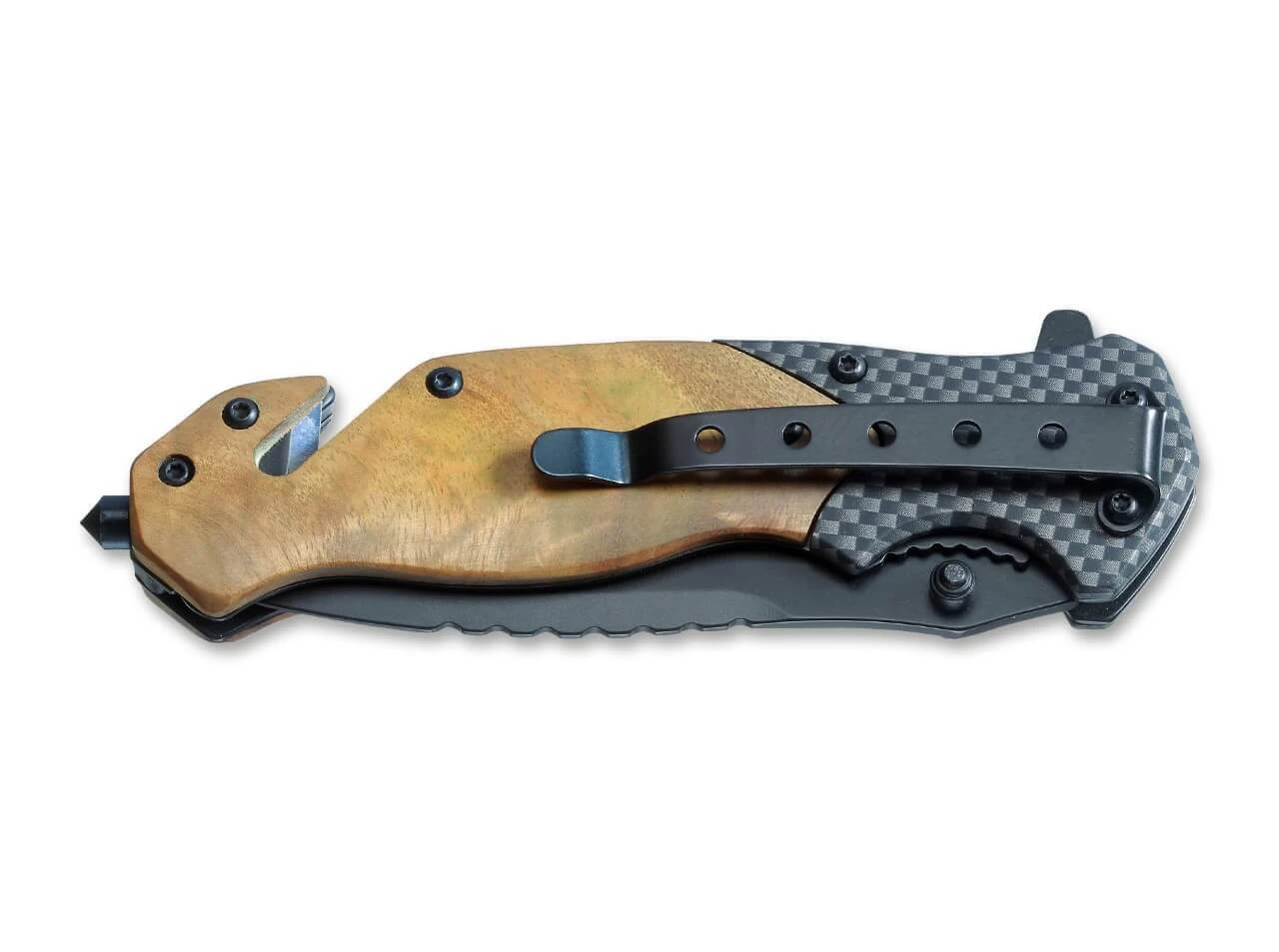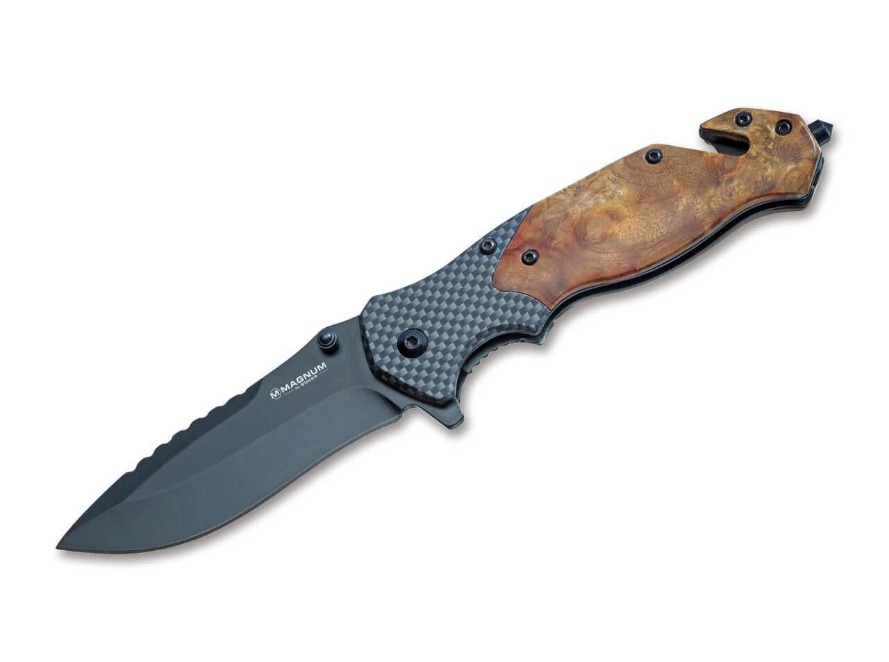 Ein Taschenmesser-Paket, wie es umfassender kaum ausgestattet sein könnte. Das Magnum Blomkvist vereint mit Hauptklinge, Glasbrecher und Gurtschneider drei Funktionen und wird mit einer praktischen Gürteltasche aus Nylon ausgeliefert, in der in einem abgetrennten Fach zusätzlich noch ein Schleifstein untergebracht ist. Die titanbeschichtete Klinge aus rostfreiem 440A kann sowohl per Flipper als auch per Daumenpin geöffnet werden und wird von einem stabilen Linerlock gesichert. Die Griffschalen aus marmoriertem Quittenholz verleihen dem Messer eine angenehm warme und natürliche Ausstrahlung und setzen sich deutlich von den modernen Backen in Carbon-Optik ab. Das hochwertige Gürteletui kann horizontal oder vertikal am Gürtel getragen werden. Für erweiterte Trageoptionen und mehr Flexibilität ist das vielseitige Blomkvist zudem mit einem Deep-Carry-Clip (Tip-down) ausgestattet.