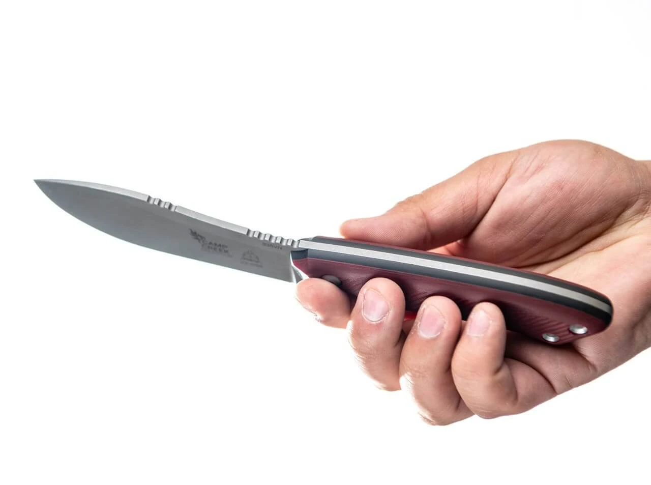Aufbauend auf der Ur-Variante des TOPS Camp Creek verpasst Messerdesigner Leo Espinoza diesem Jagdmesser einen verbreiterten Griff aus feuerrotem G10 und eine etwas bauchigere Klinge aus pulvermetallurgischem CPM-S-35VN für das perfekte Häuten des erlegten Wildes. Das in Vollerl-Bauweise konstruierte Campingmesser ist mit zwei Hohlnieten am Griff für die Befestigung eines Lanyards versehen und wird mit einer hochwertigen Lederscheide geliefert.
